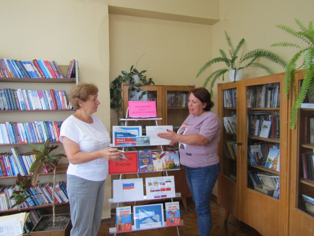 державы символ»  и одноименная выставка. Заведующая отделом обслуживания Марина Титова рассказала посетителям библиотеки  о значении флага, об истории его возникновения и всех изменениях, которые с ним происходили.