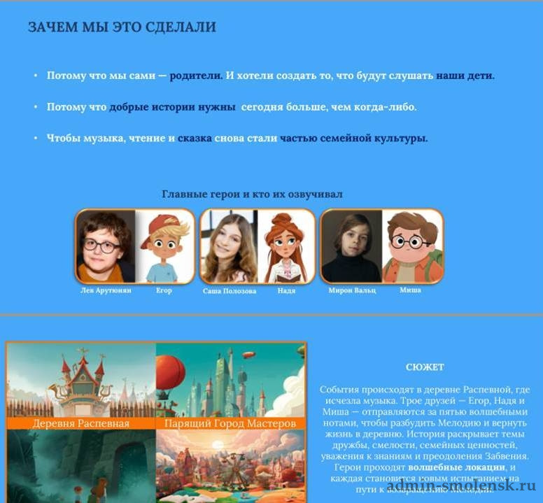 Это яркое семейное приключение для детей, родителей и всех, кто верит в чудеса. История рассказывает о трёх друзьях — Егоре, Наде и Мише, которые отправляются в волшебное путешествие, чтобы пробудить спящую музыку и вернуть радость в мир.