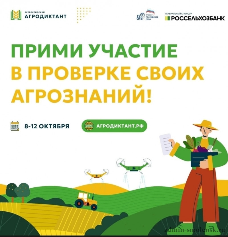 С 8 по 12 октября 2025 года пройдет первый Всероссийский Агродиктант - федеральный проект, ориентированный на популяризацию сельского хозяйства, аграрных профессий и образа жизни на селе, повышение знаний об агропромышленном комплексе России. Проводится в рамках федерального партийного проекта «Российское село» партии «Единая Россия» совместно с Россельхозбанком при поддержке Министерства сельского хозяйства Российской Федерации.